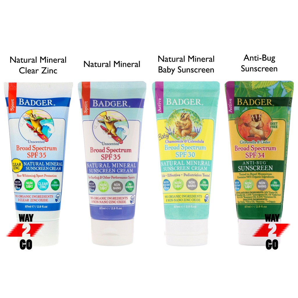 Badger Co Inc which makes natural and organic body care products and purports to be the No. Baby Bum Water Resistant Sunscreen Lotion SPF 50 Babyganics Kids Sunscreen Lotion SPF 50 Babyganics Mineral-Based Baby Sunscreen Spray SPF 50 Badger Baby Sunscreen Cream - Chamomile And Calendula SPF 30 Badger Kids Broad Spectrum Natural Mineral Sunscreen Cream SPF 40 Banana Boat Aloe Vera Sun Burn Relief Gel. Reef safe mineral sunscreens for your who family with safe mineral zinc oxide.