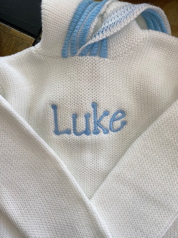 Sweater Color Size Please. Designed by Sarah Punderson. Choose from baby blue baby pink or ivory sweater colors in sizes from 3 months all the way up to 24 months.