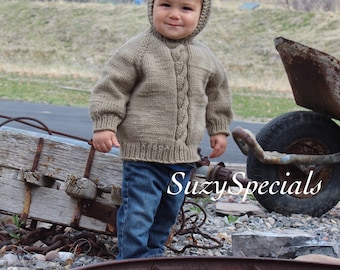 Hooded Baby Sweater with Cable and Back Zipper pattern by Karen Spotten Pattern includes easy to follow instructions.