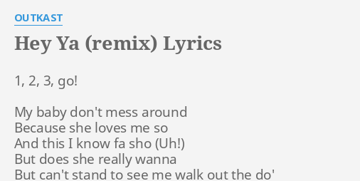 Lyrics of Love. Hey Ya remix One two three go My baby dont mess around Because she loves me so And this I know for sure But does she really want to But cant stand to see me Walk out the door Dont try to fight the feelin Cause the thought alone Is killing me right now Thank God for Mom and Dad For sticking through together Cause we dont know how Hey. One two three uh.