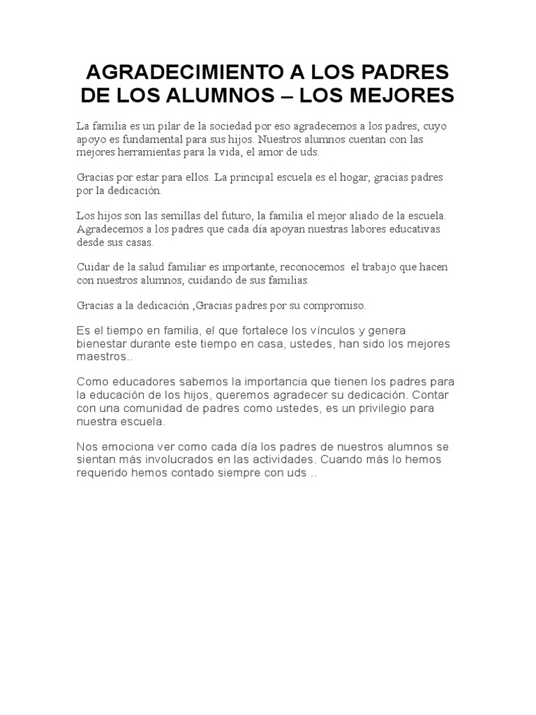 Así mismo es sabido que la formación de los estudiantes debe ser una tarea compartida entre escuela y. Es el tiempo en familia el que fortalece los vínculos y genera bienestar para los miembros. Gracias familia los amo. Todo lo que soy y lo que llegaré a ser se lo debo a mi querida familia. Formato para hacer reconocimientos a los alumnos y padres por sus tareas al final del ciclo escolar. Seamos siempre así y estemos eternamente unidos por siempre. Agradezco mucho al Señor por la bella familia que tengo.